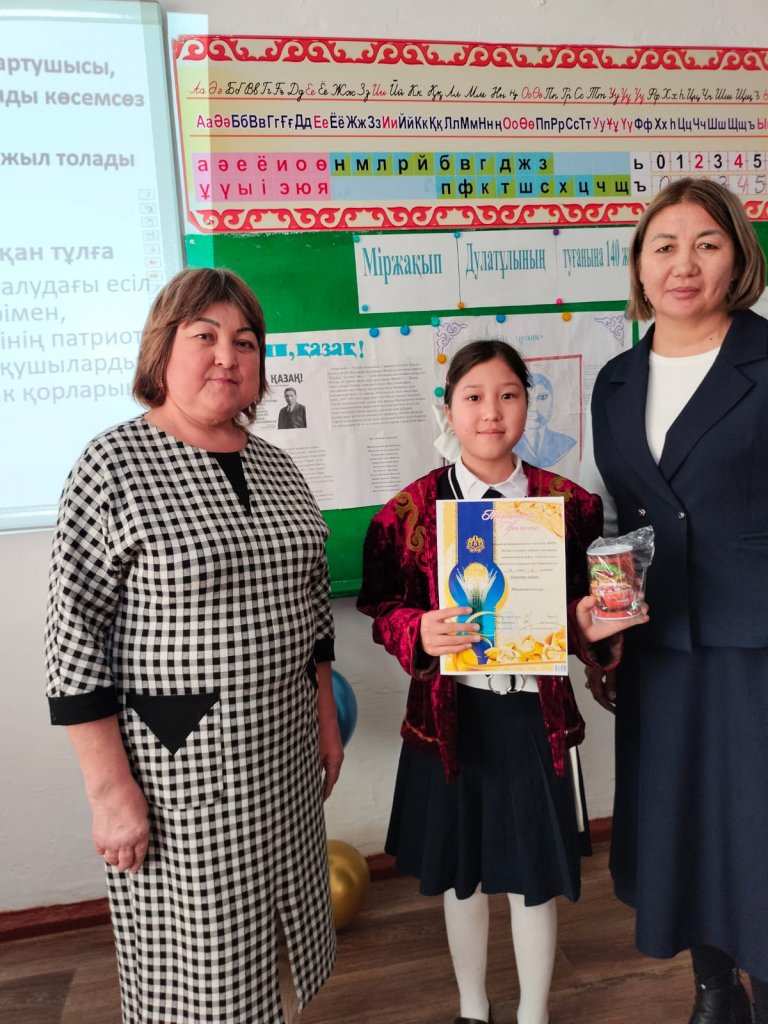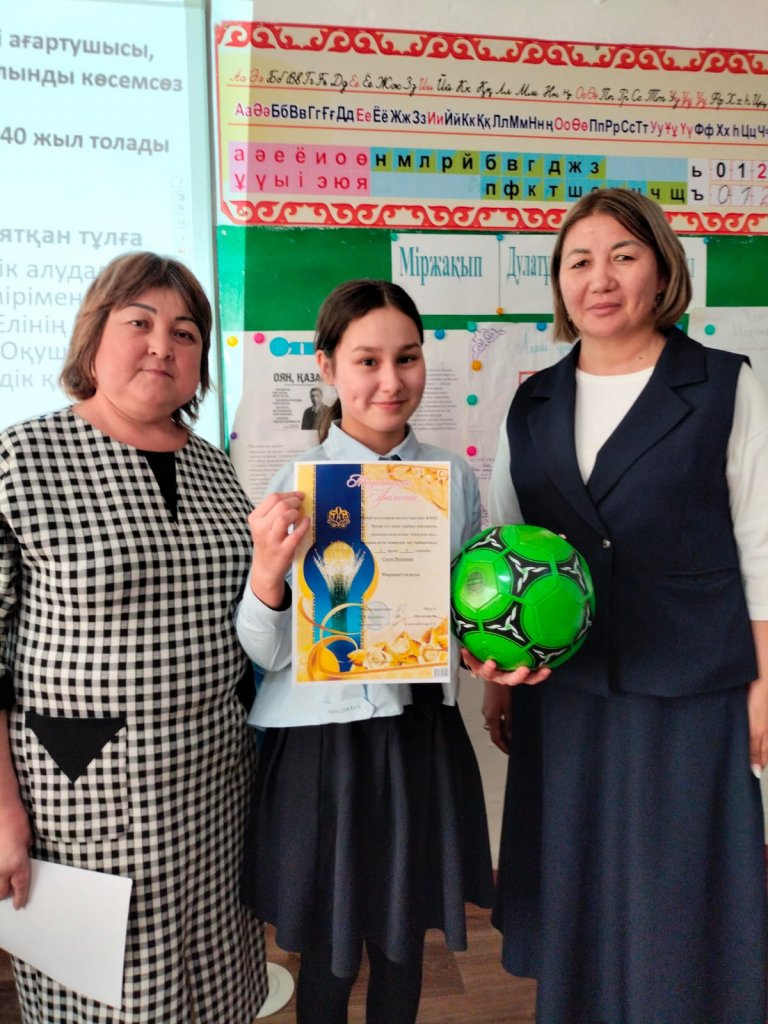 «Мәнерлеп оқу» байқауы бойынша бас жүлде – 7 сынып оқушысы Сатім Айару; I орын иегерлері – 6-сынып оқушысы Додай Назерке, Байкенже Ақерке; ІІ орын иегерлері 5 сынып оқушысы Сатім Мейіржан, 8 сынып оқушысы Танат Мадина; ІІІ орын иегерлері 6 сынып оқушысы Таңат Іңкәр, 7 сынып оқушысы Додай Назлы, 8 сынып оқушысы Қабашева Алгиза иеленді.